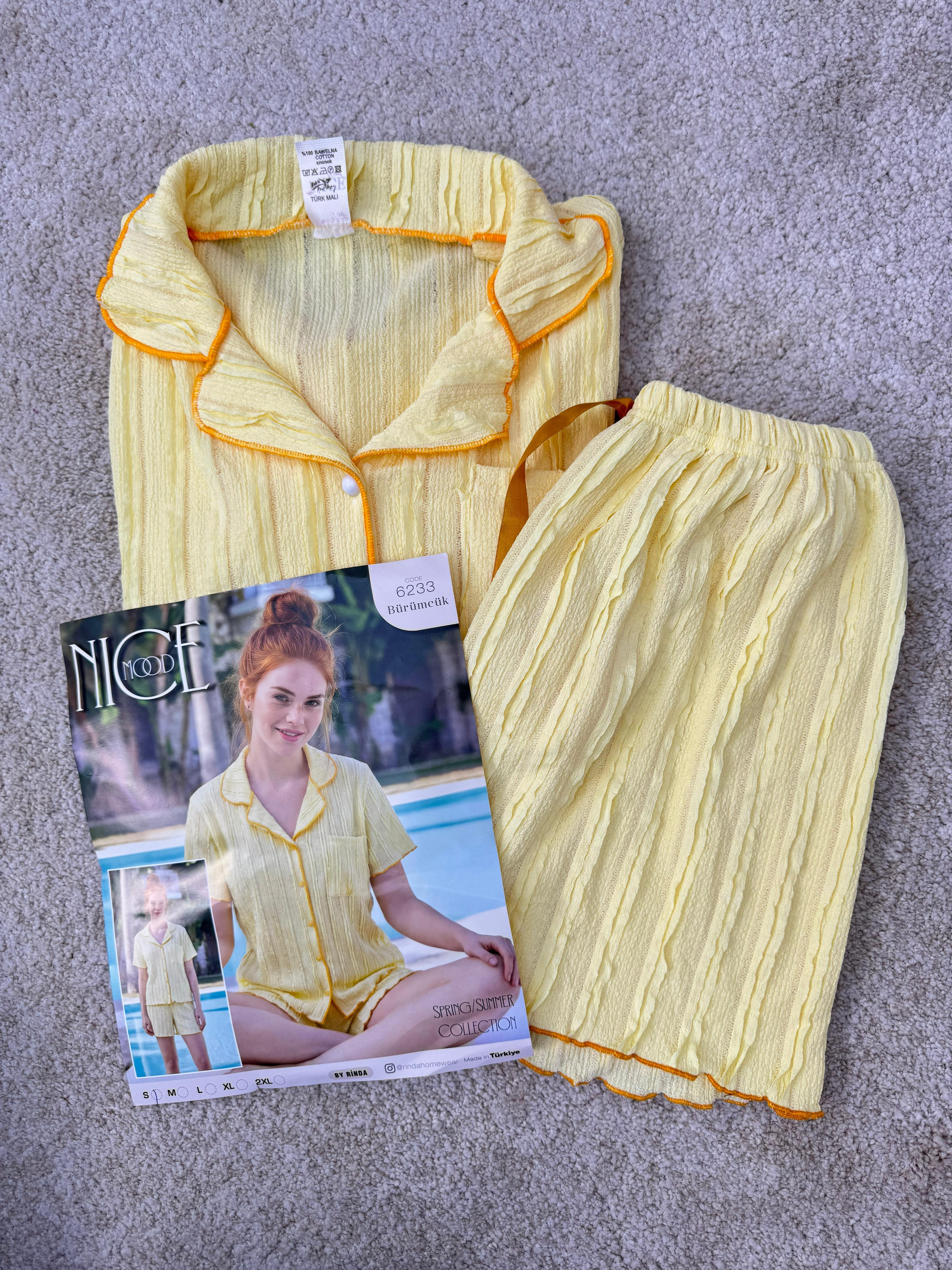ç6233-bürümcük kumaş şortlu pijama takımı-sarı (ç6233)