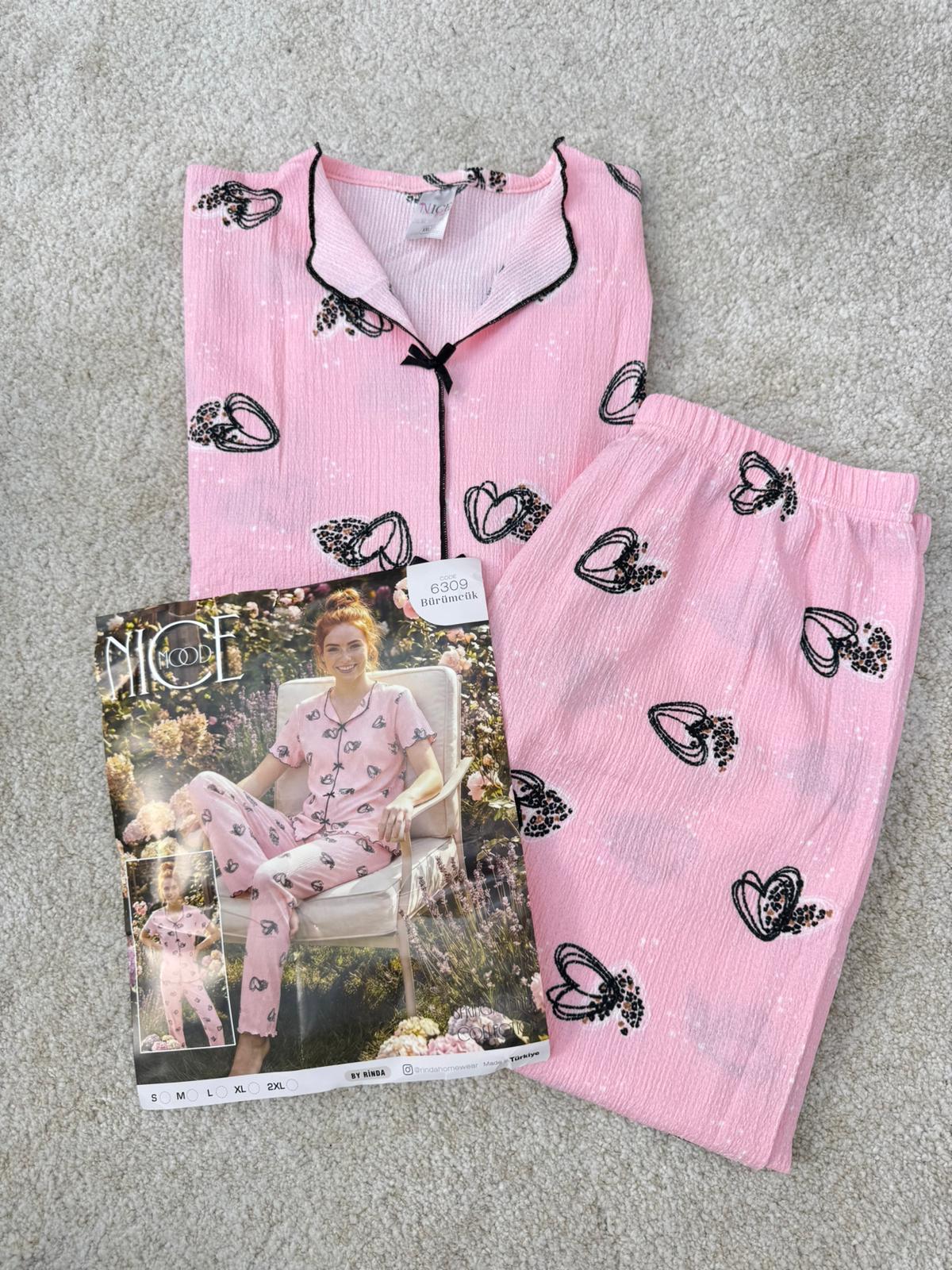 ç6309-bürümcük kumaş fiyonklu pijama takımı-pembe (ç6309)