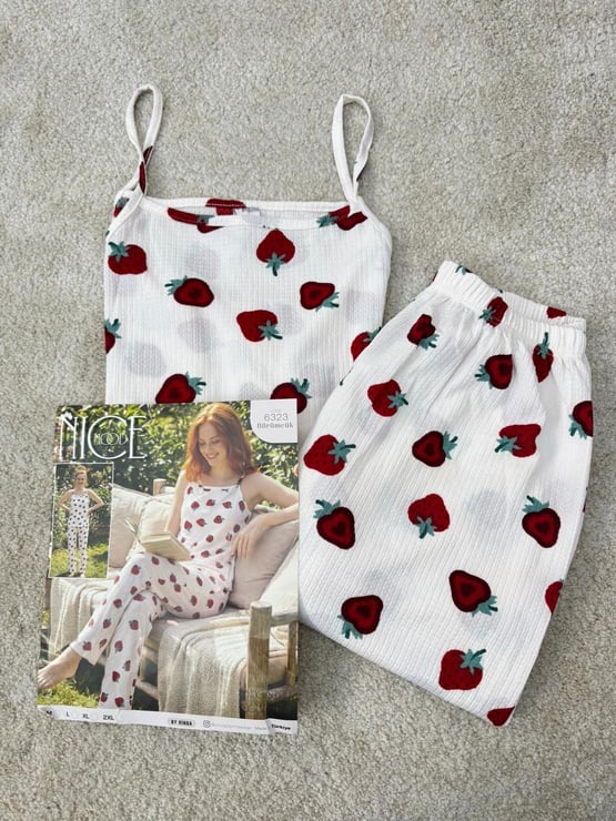 ç6323-bürümcük kumaş ip askılı çilekli pijama takımı-beyaz (ç6323)