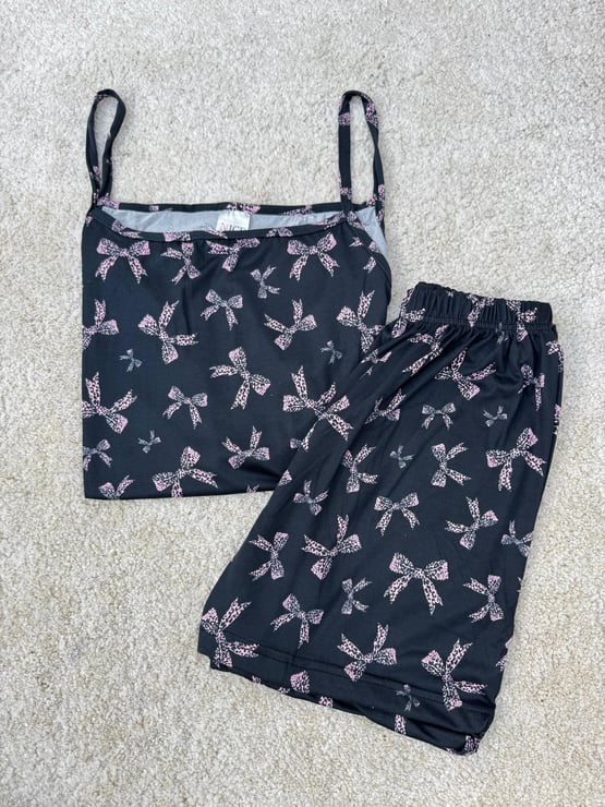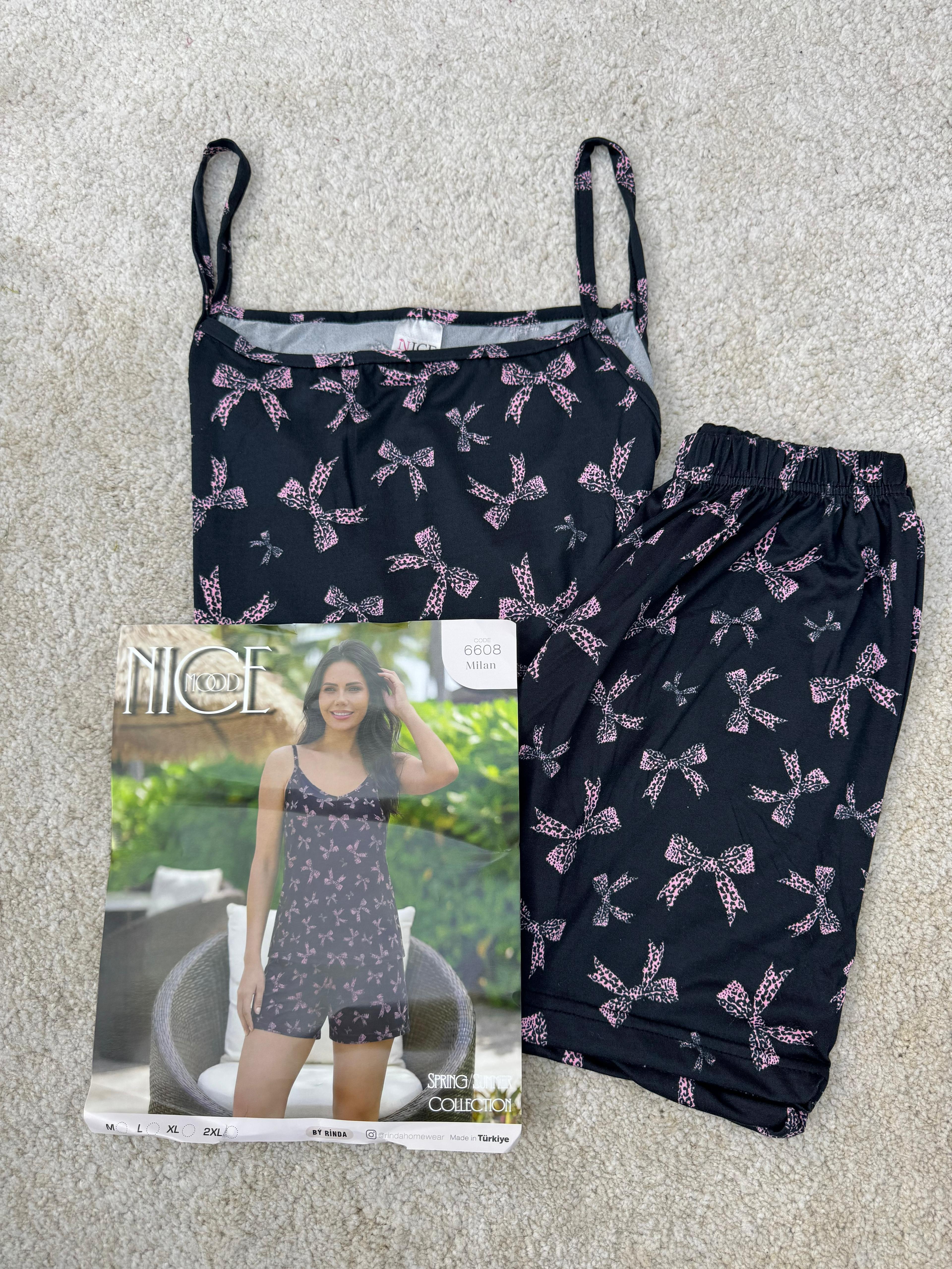ç6608-milan kumaş fiyonklu şortlu pijama takımı-siyah (ç6608)