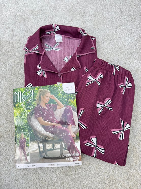 ç6618-bürümcük kumaş gömlek yaka kısa kollu pijama takımı-bordo (ç6618)
