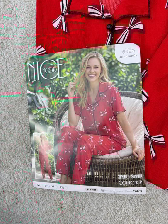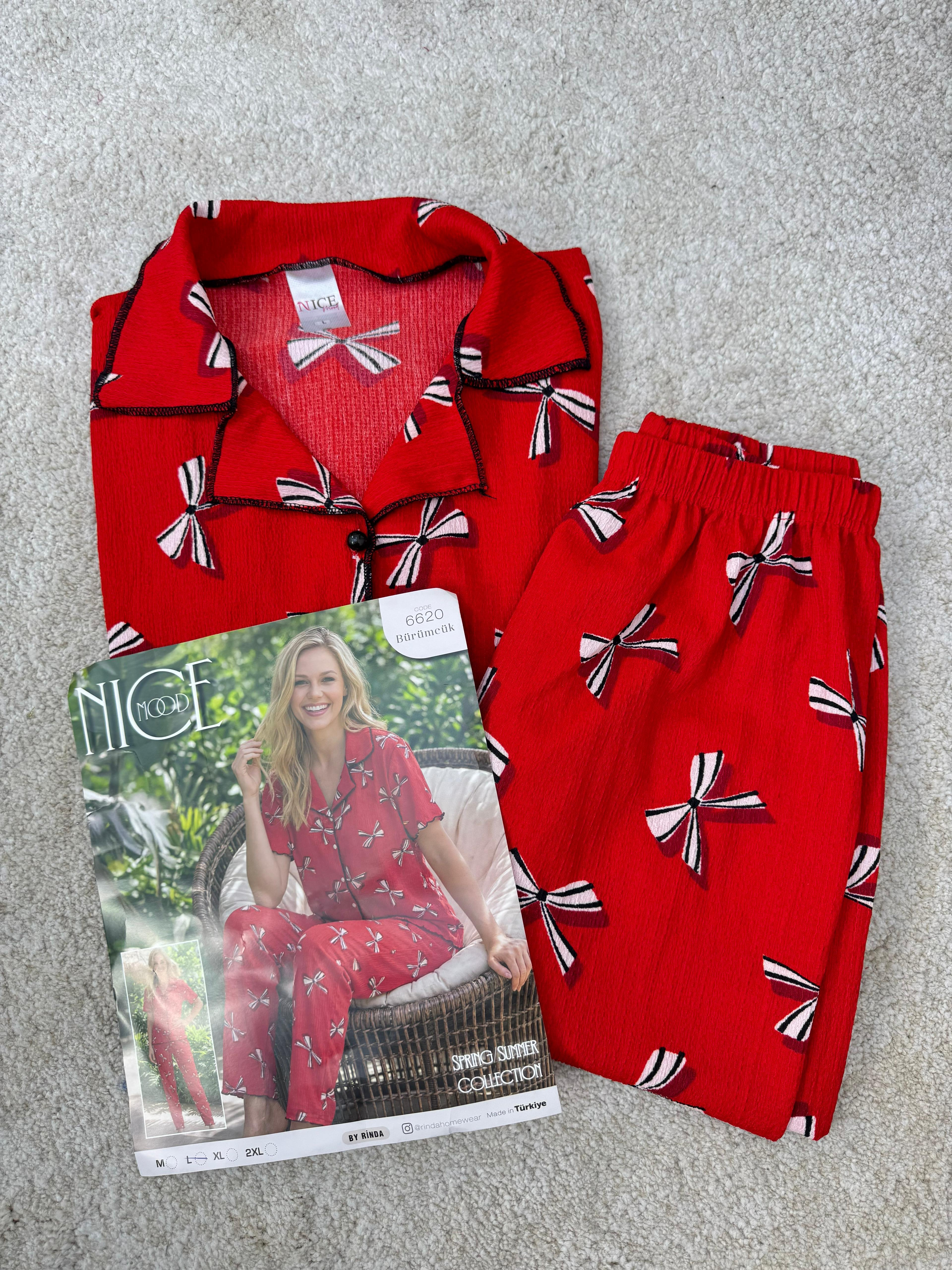 ç6620-bürümcük kumaş gömlek yaka kısa kollu pijama takımı-kırmızı (ç6620)