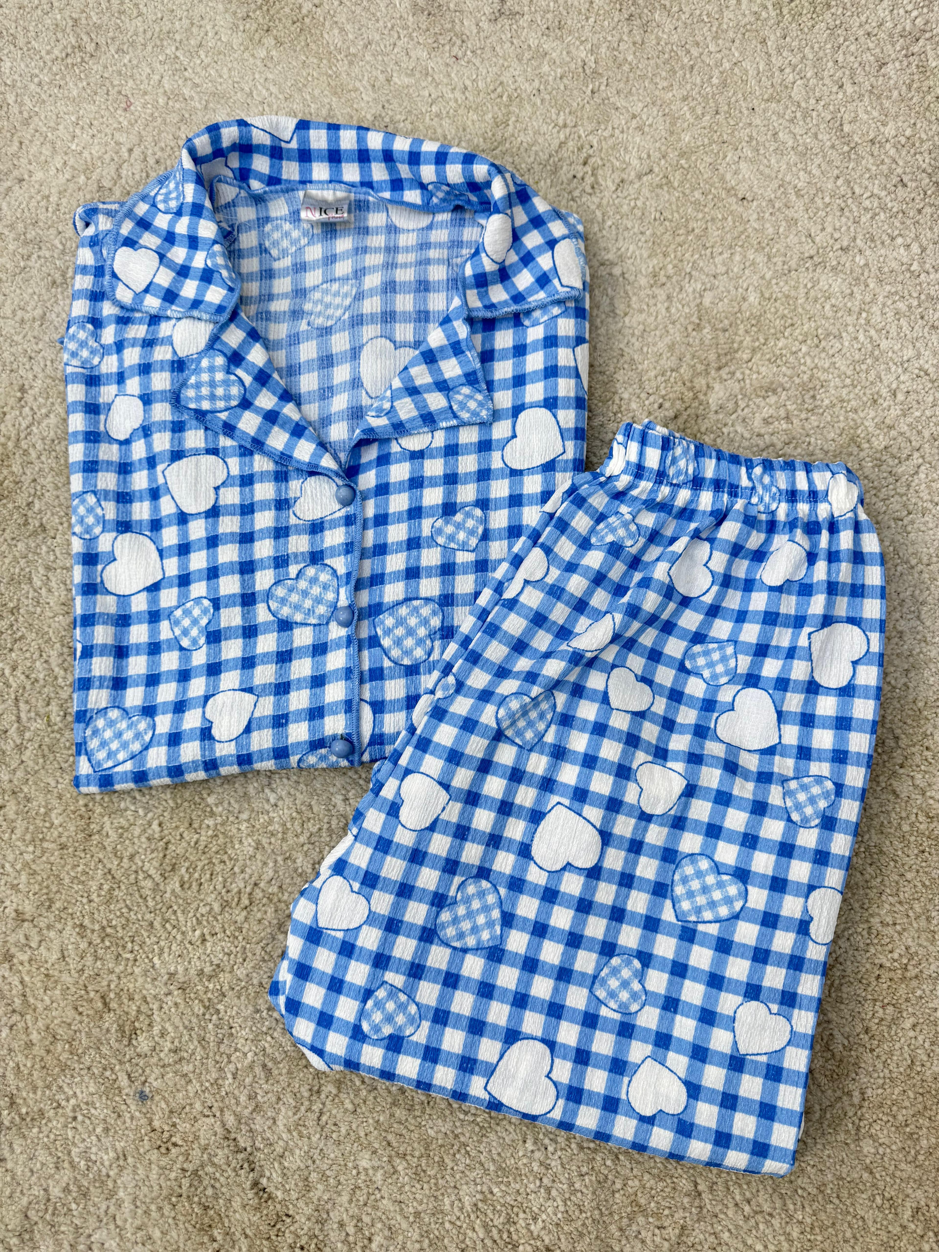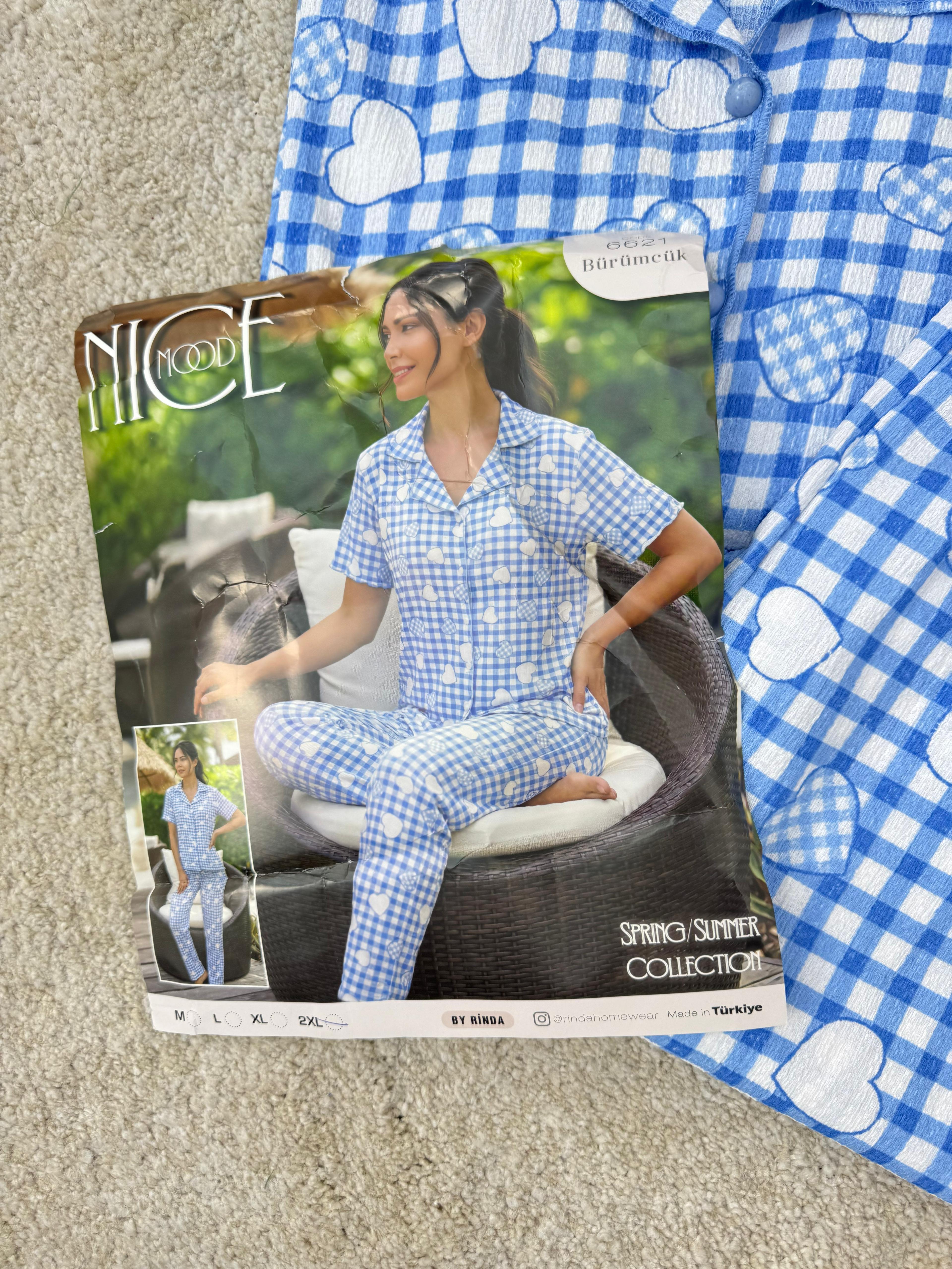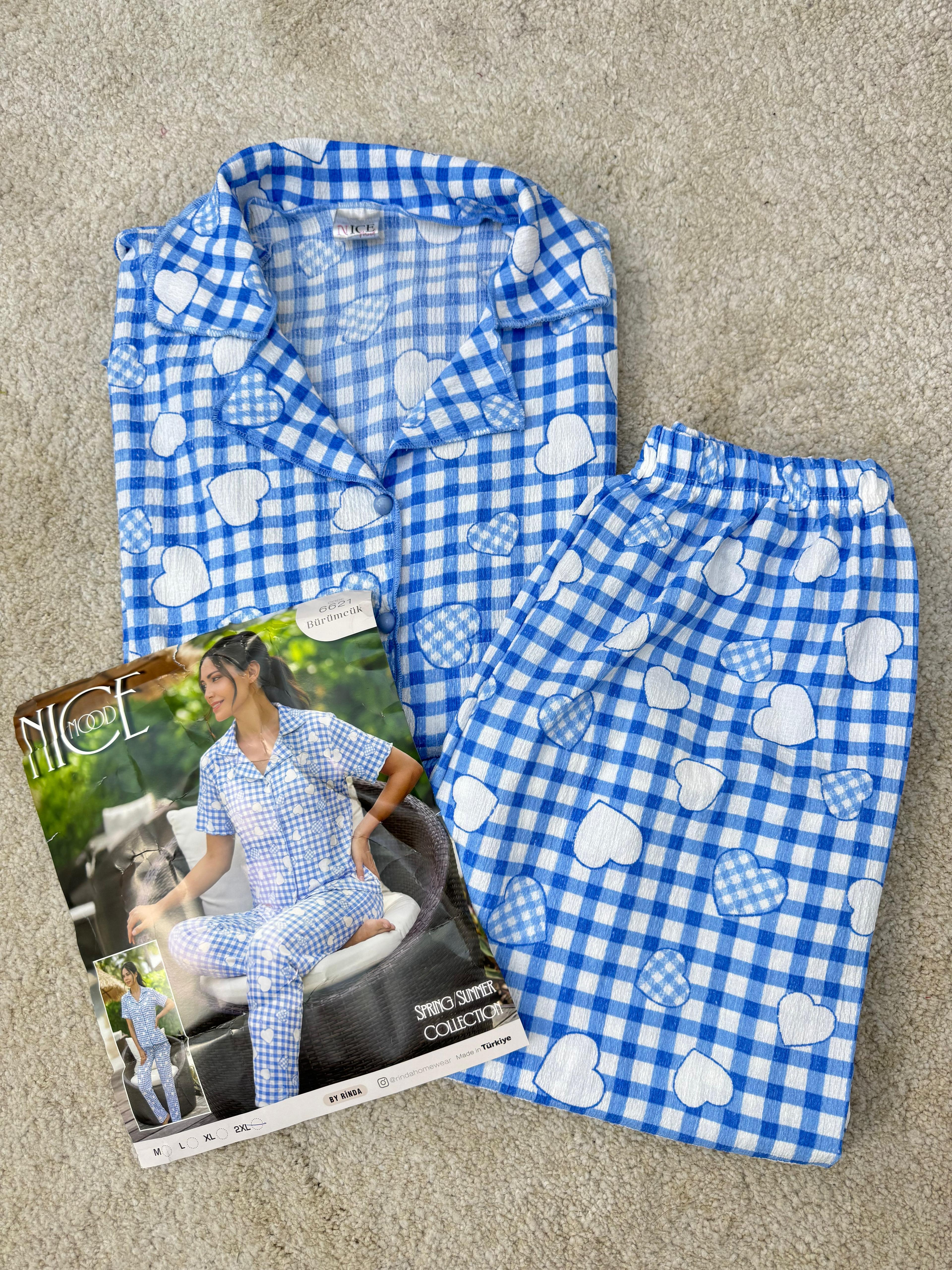 ç6621-bürümcük kumaş gömlek yaka kısa kollu pijama takımı-mavi (ç6621)