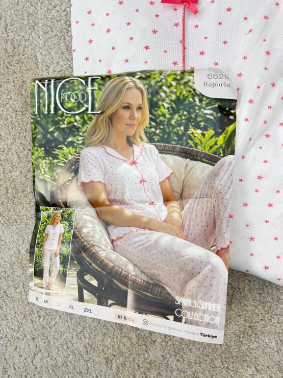 ç6629-raporlu bürümcük kumaş kısa kollu pijama takımı-beyaz (ç6629)