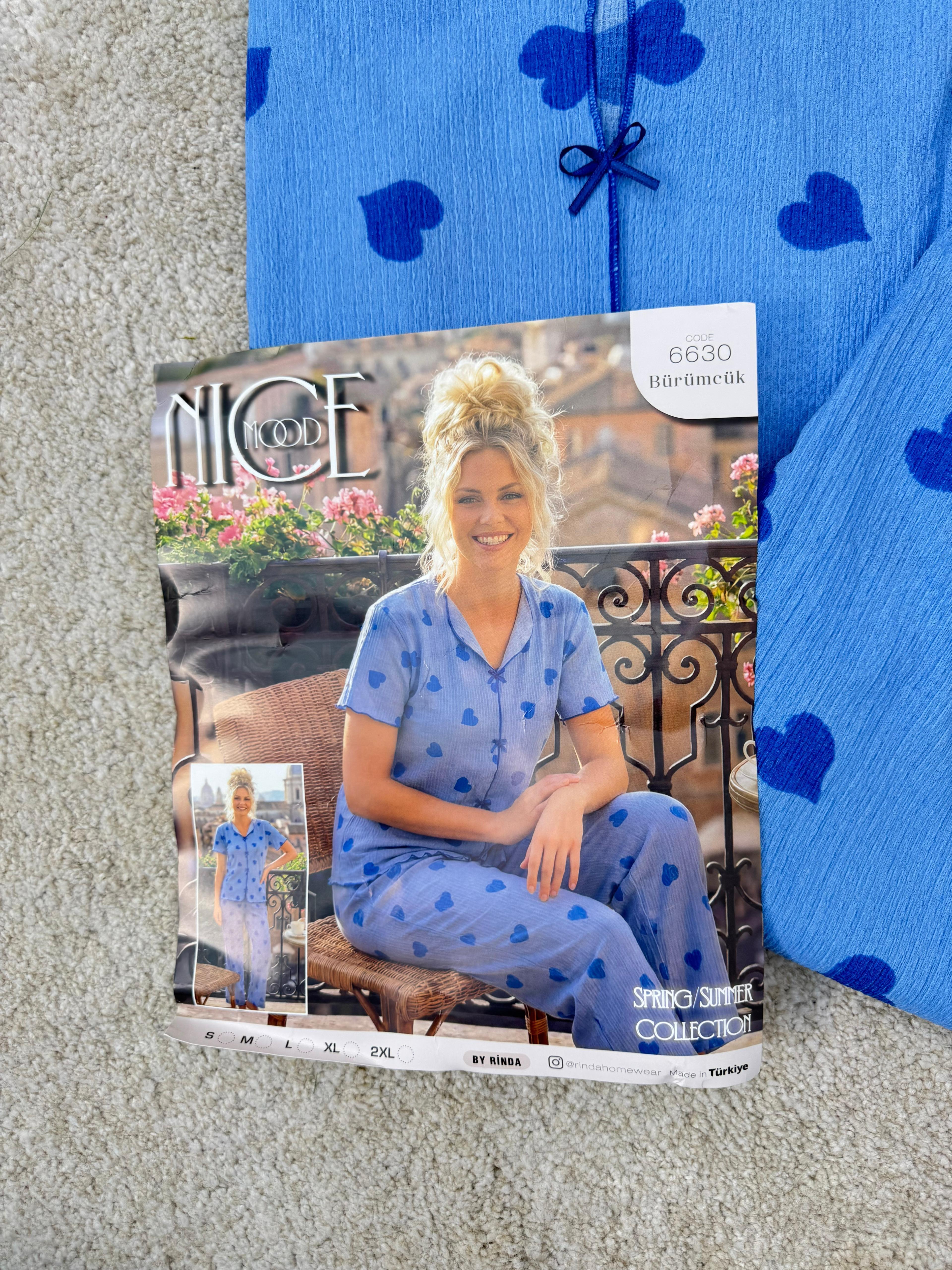 ç6630-bürümcük kumaş gömlek yaka kısa kollu pijama takımı-mavi (ç6630)
