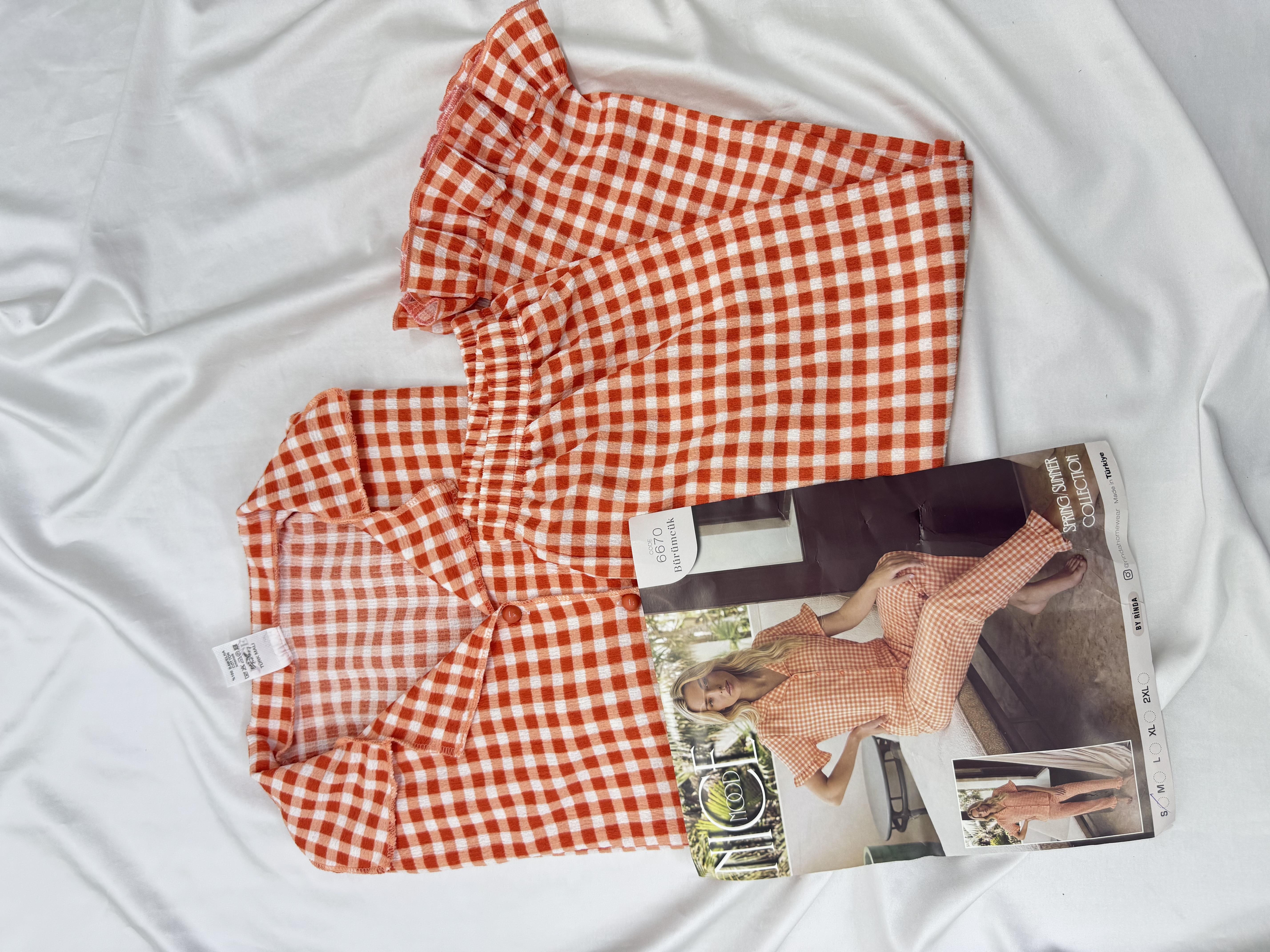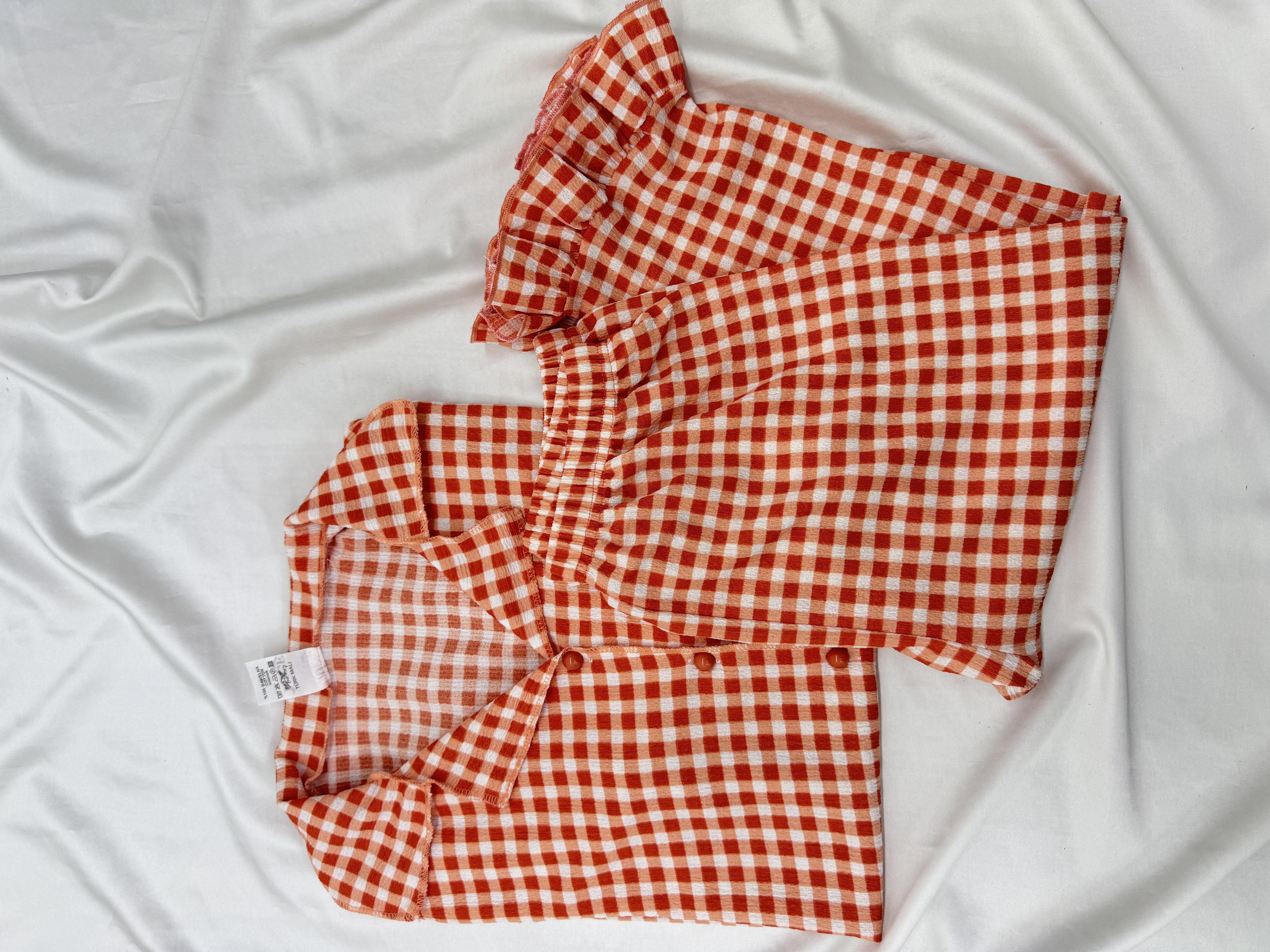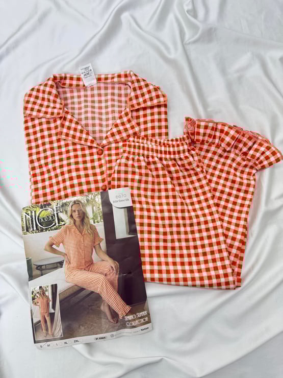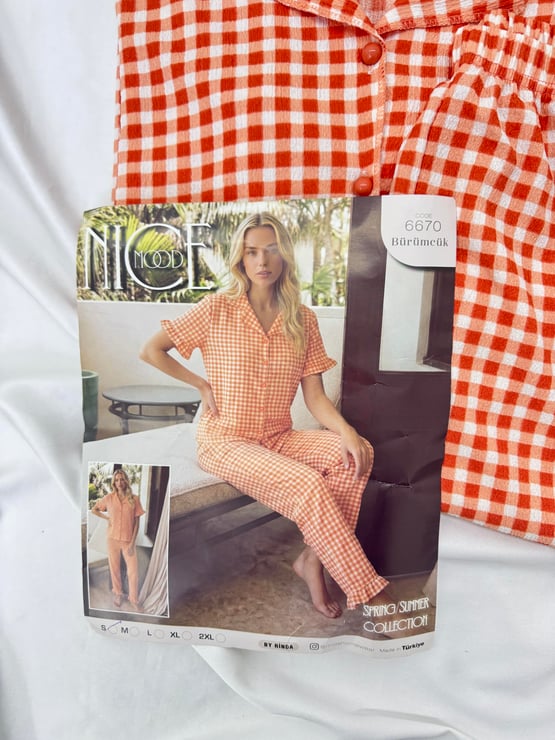 Ç6670 BÜRÜMCÜK KOL KISMI FIRFIRLI KARELİ PİJAMA TAKIMI -TURUNCU (Ç6670)
