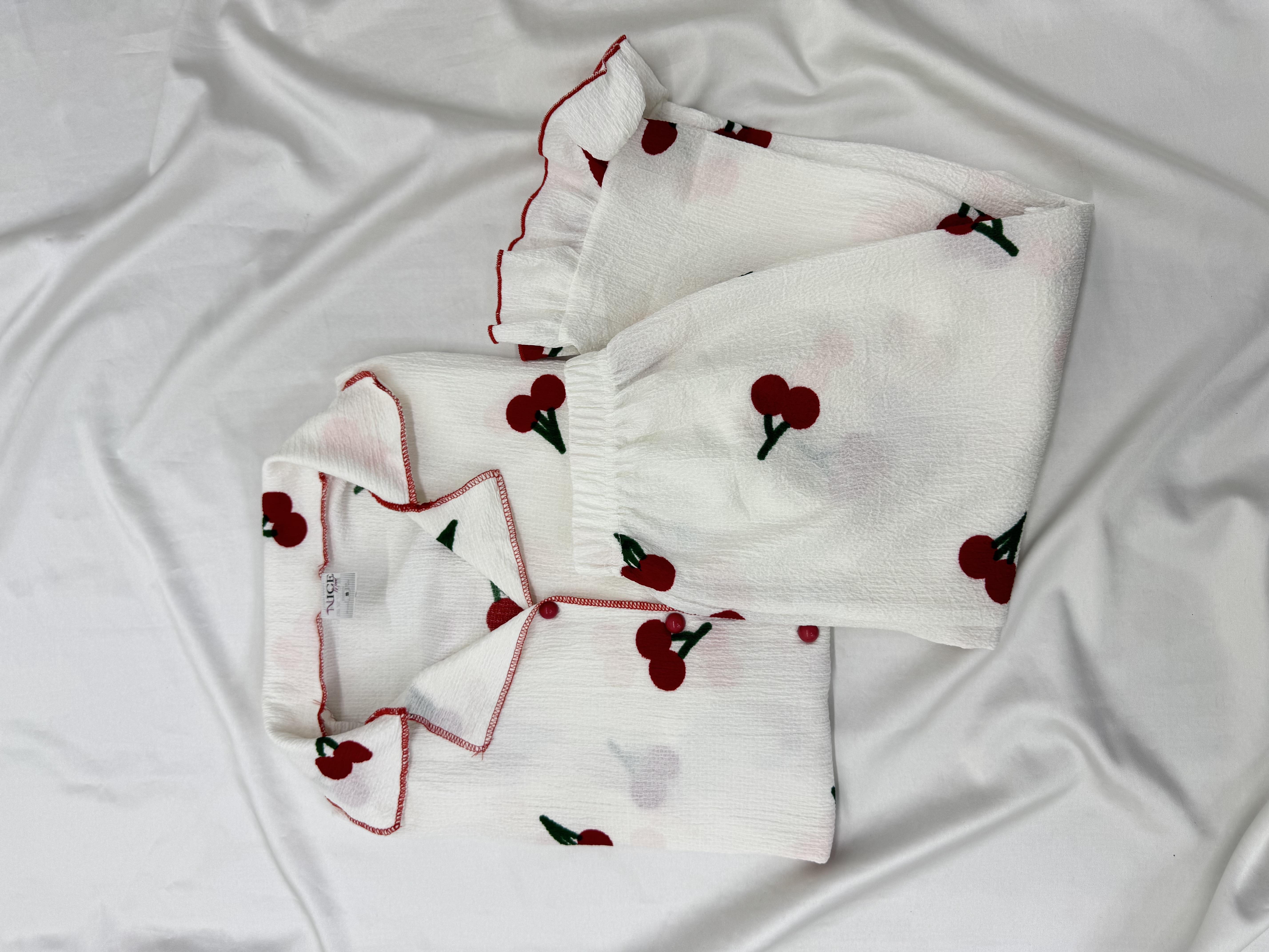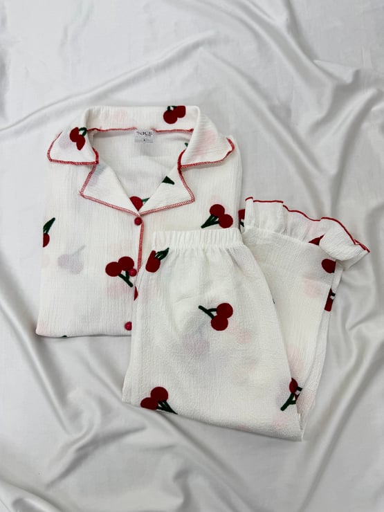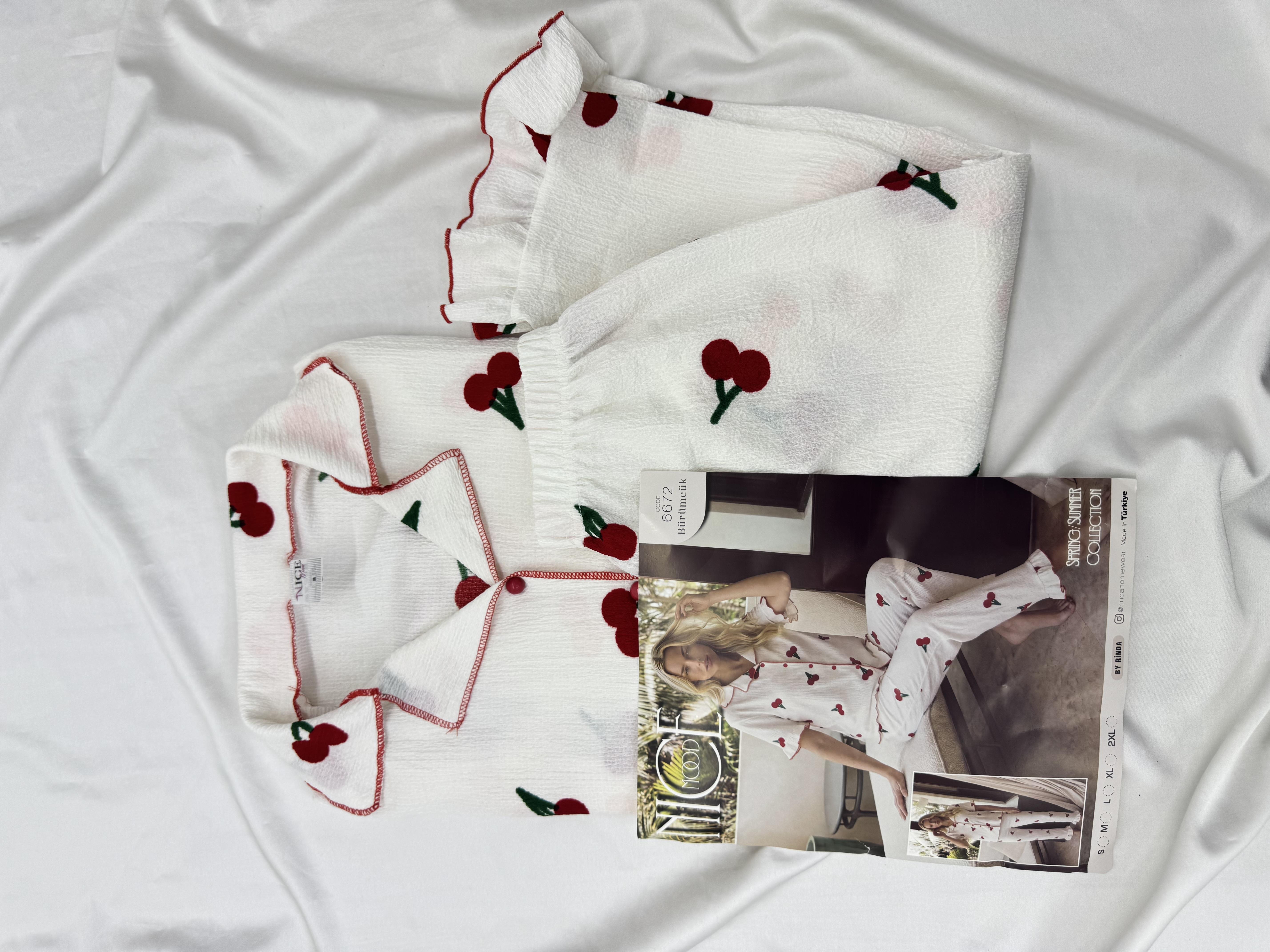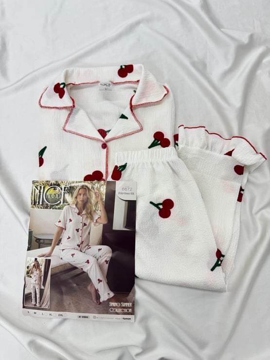 Ç6672 BÜRÜMCÜK KOL KISMI FIRFIRLI KİRAZLI PİJAMA TAKIMI -BEYAZ (Ç6672)