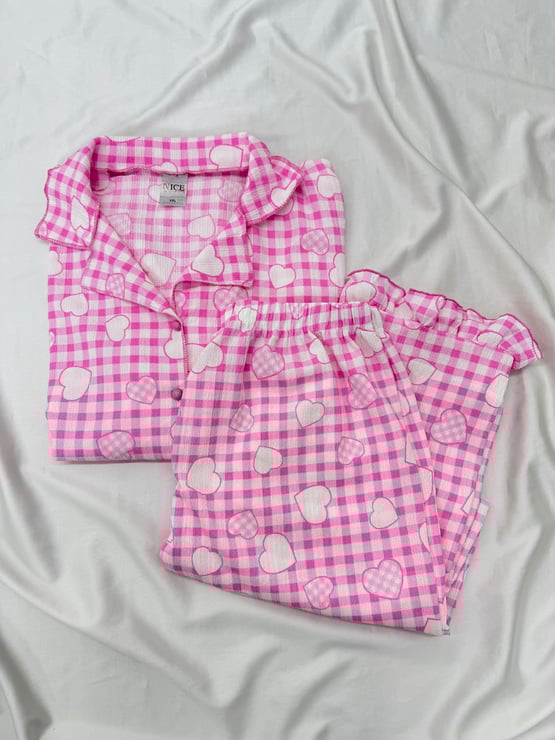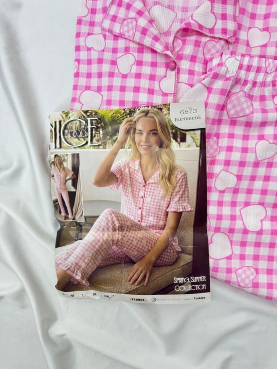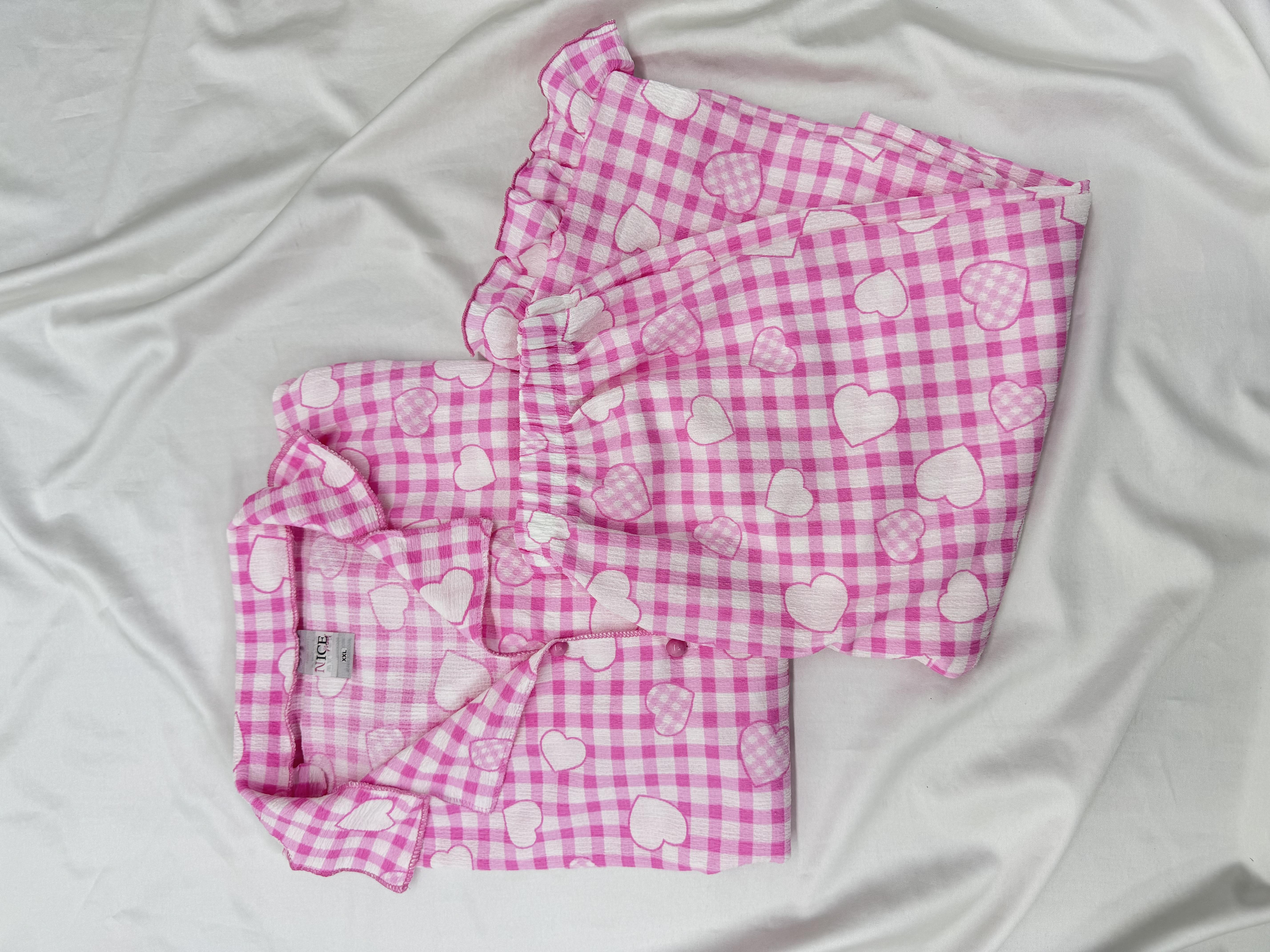 Ç6673 BÜRÜMCÜK KOL KISMI FIRFIRLI -KALPLİ PİJAMA TAKIMI -PEMBE (Ç6673)