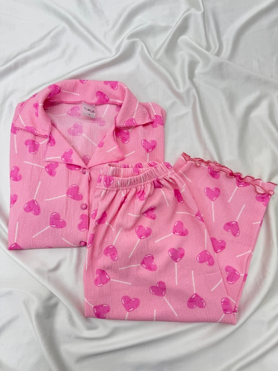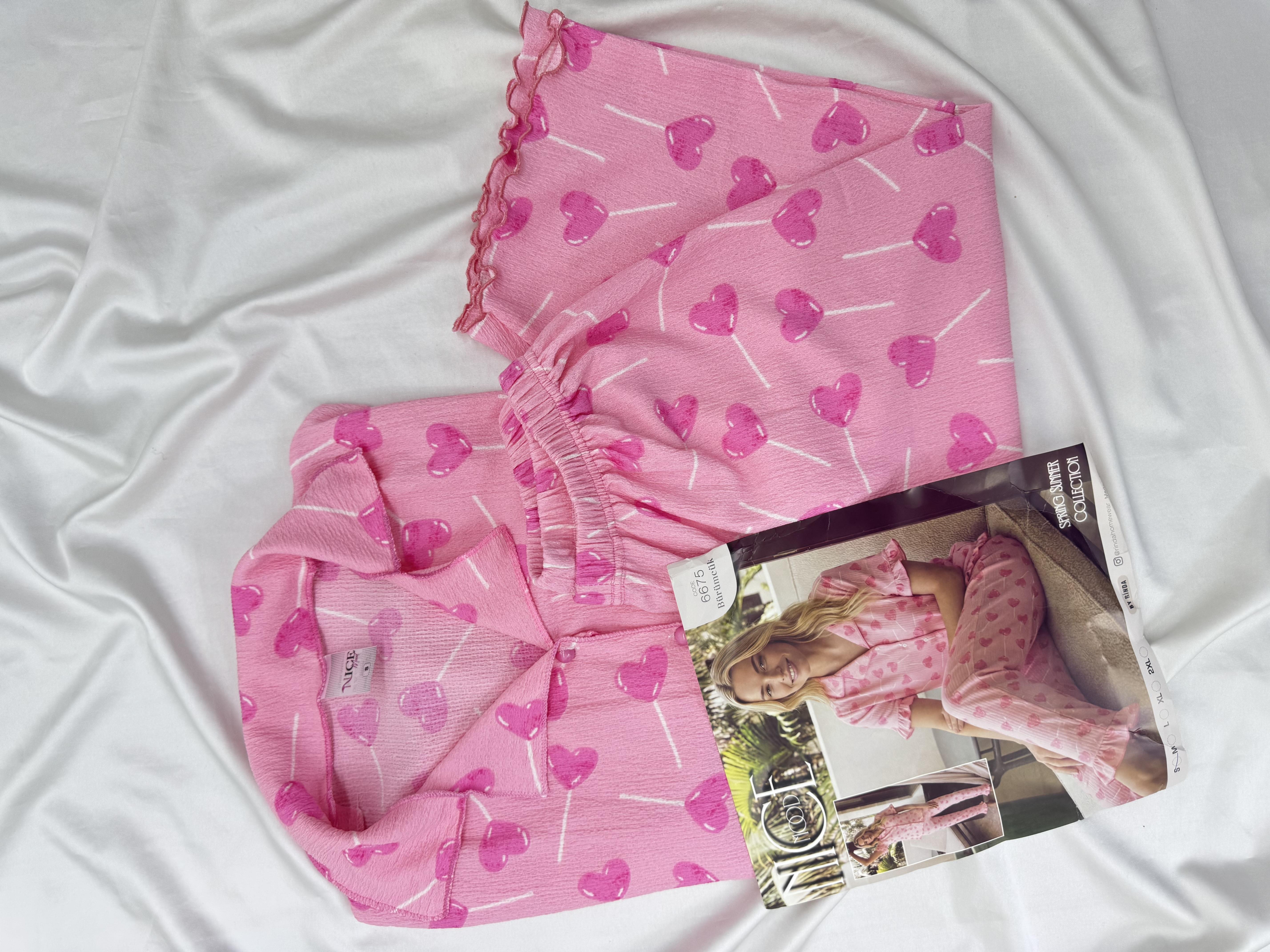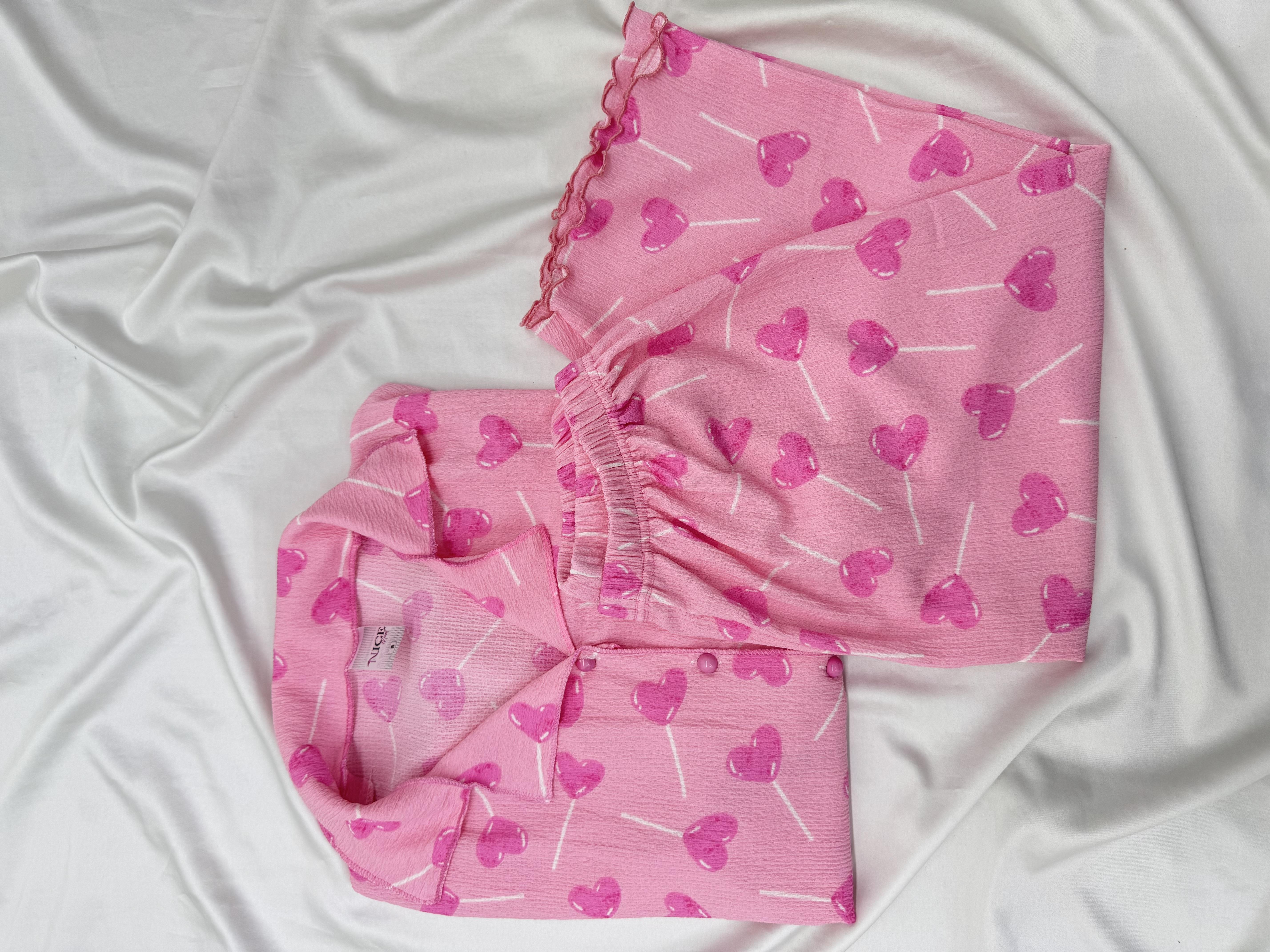 Ç6675 BÜRÜMCÜK KOL KISMI FIRFIRLI KALPLİ PİJAMA TAKIMI -PEMBE (Ç6675)