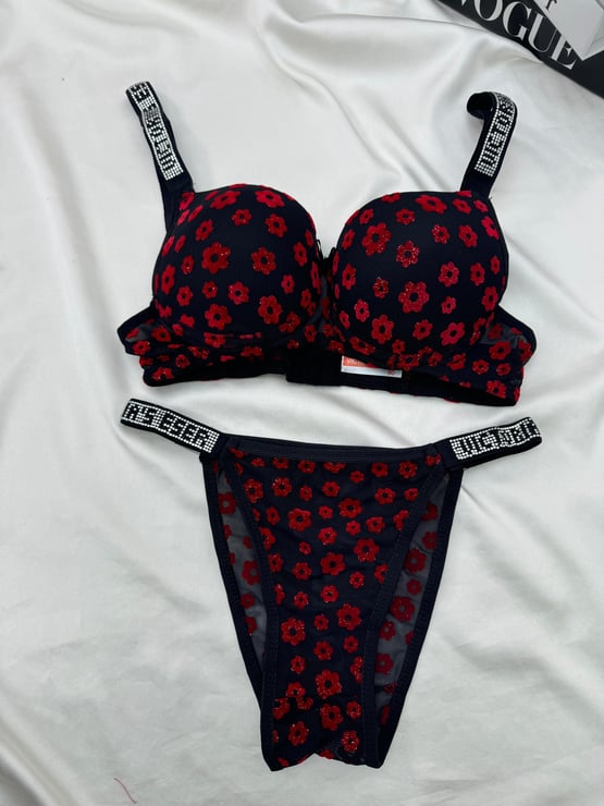 Ç71 - DESTEKLİ KIRMIZI ÇİÇEKLİ ASKILARI TAŞ SÜTYEN TAKIMI - SİYAH