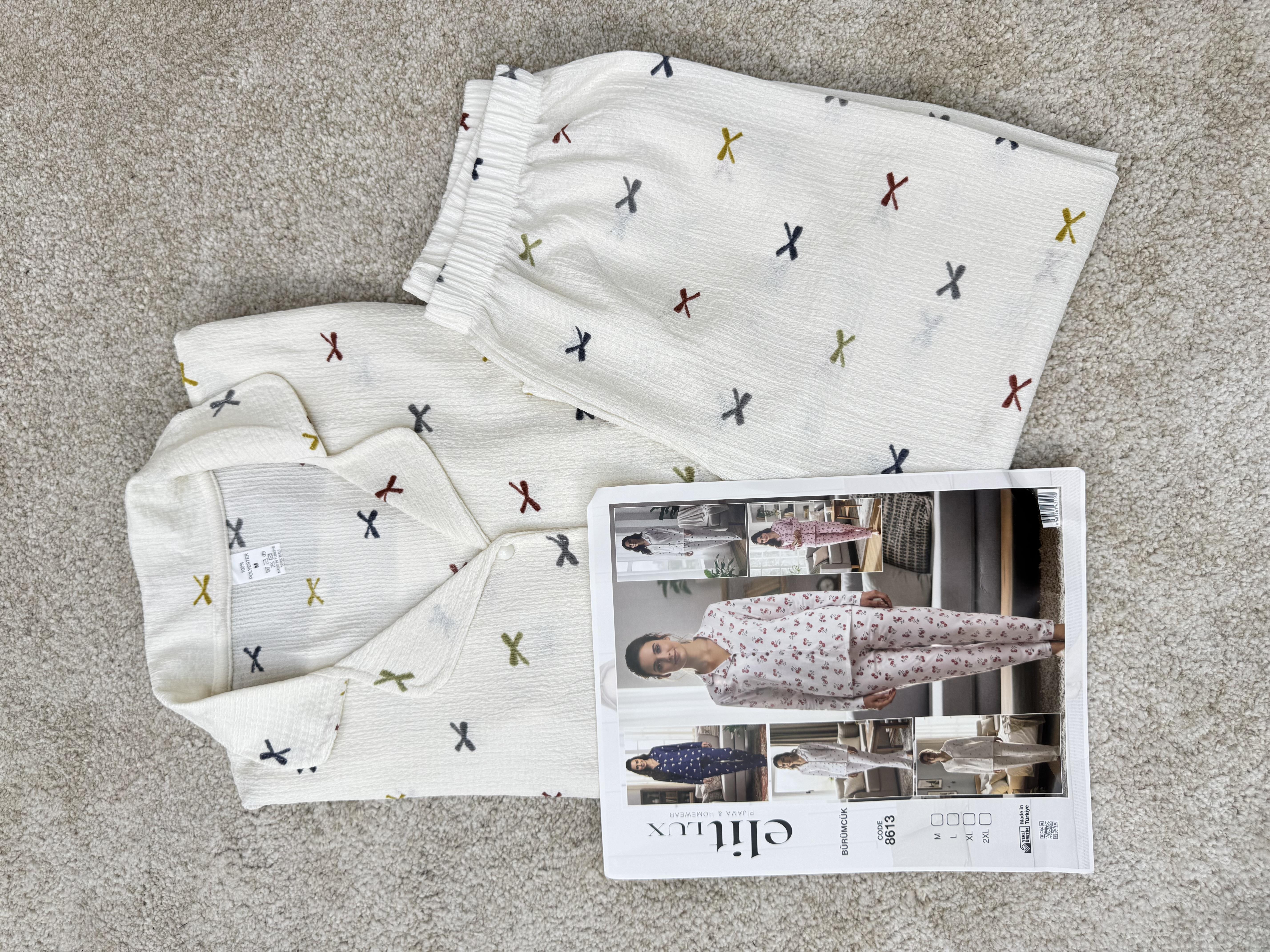 ç8613-bürümcük kumaş gömlek yaka fiyonklu pijama takımı-beyaz (ç8613)
