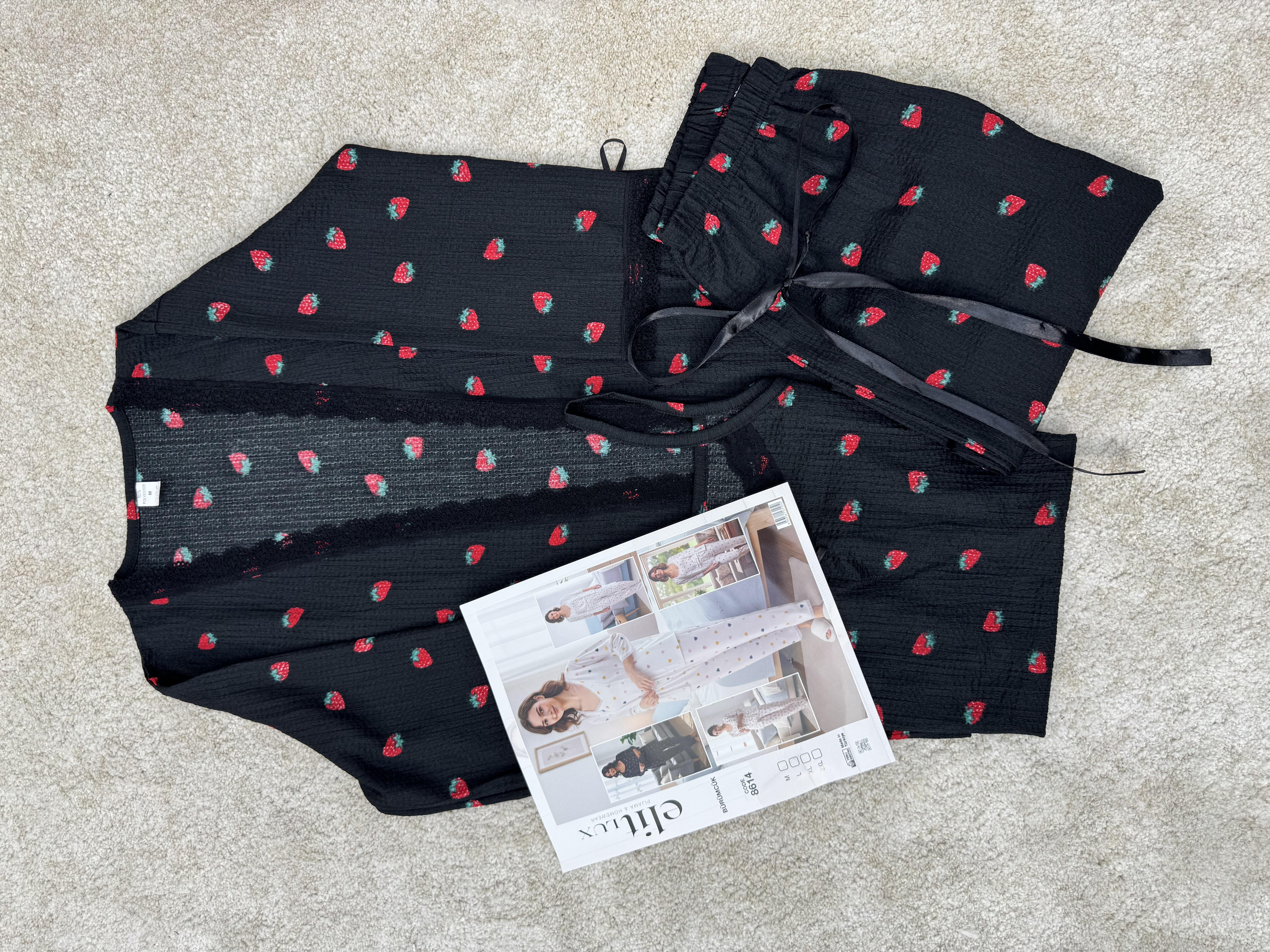 ç8614-bürümcük kumaş çilekli 3lü pijama takımı-siyah (ç8614)