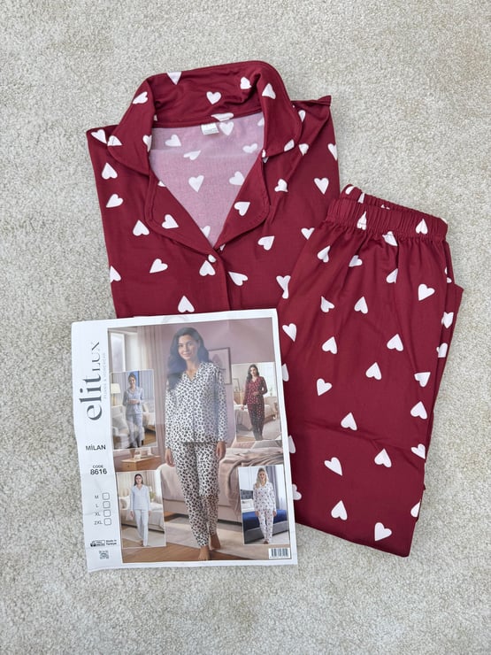 ç8616-milan kumaş gömlek yaka kalpli pijama takımı-bordo (ç8616)