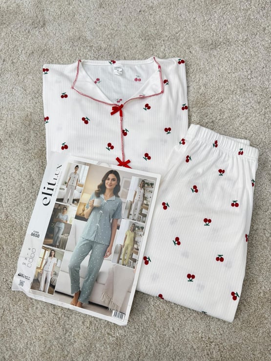 ç8658-milan kumaş kısa kollu kirazlı pijama takımı-beyaz (ç8658)