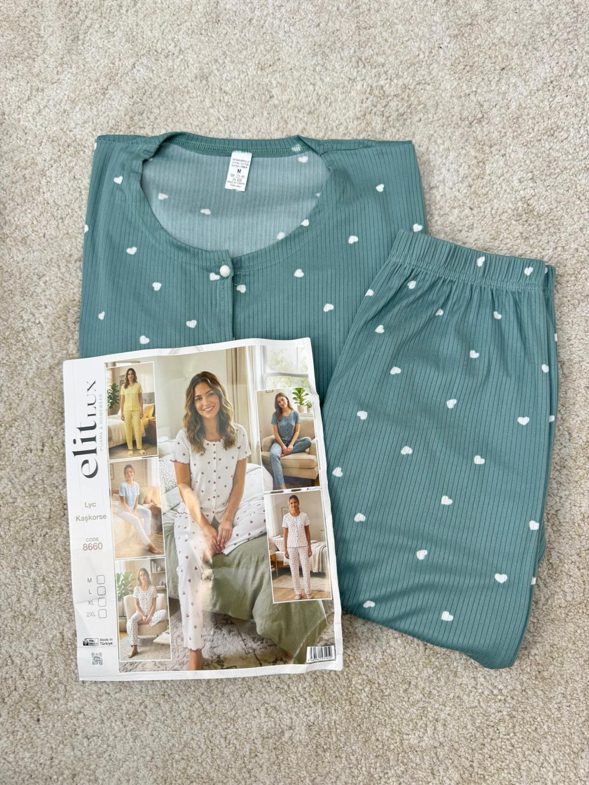 ç8660-raporlu kaşkorse kumaş kalpli pijama takımı-yeşil (ç8660)