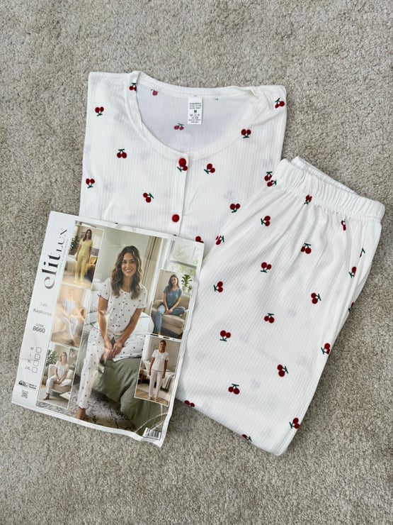 ç8660-raporlu kaşkorse kumaş kirazlı pijama takımı-beyaz (ç8660)