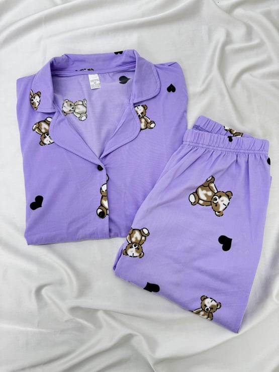 ç8666-milan kumaş gömlek yaka ayıcıklı pıjama takımı-mor (ç8666)