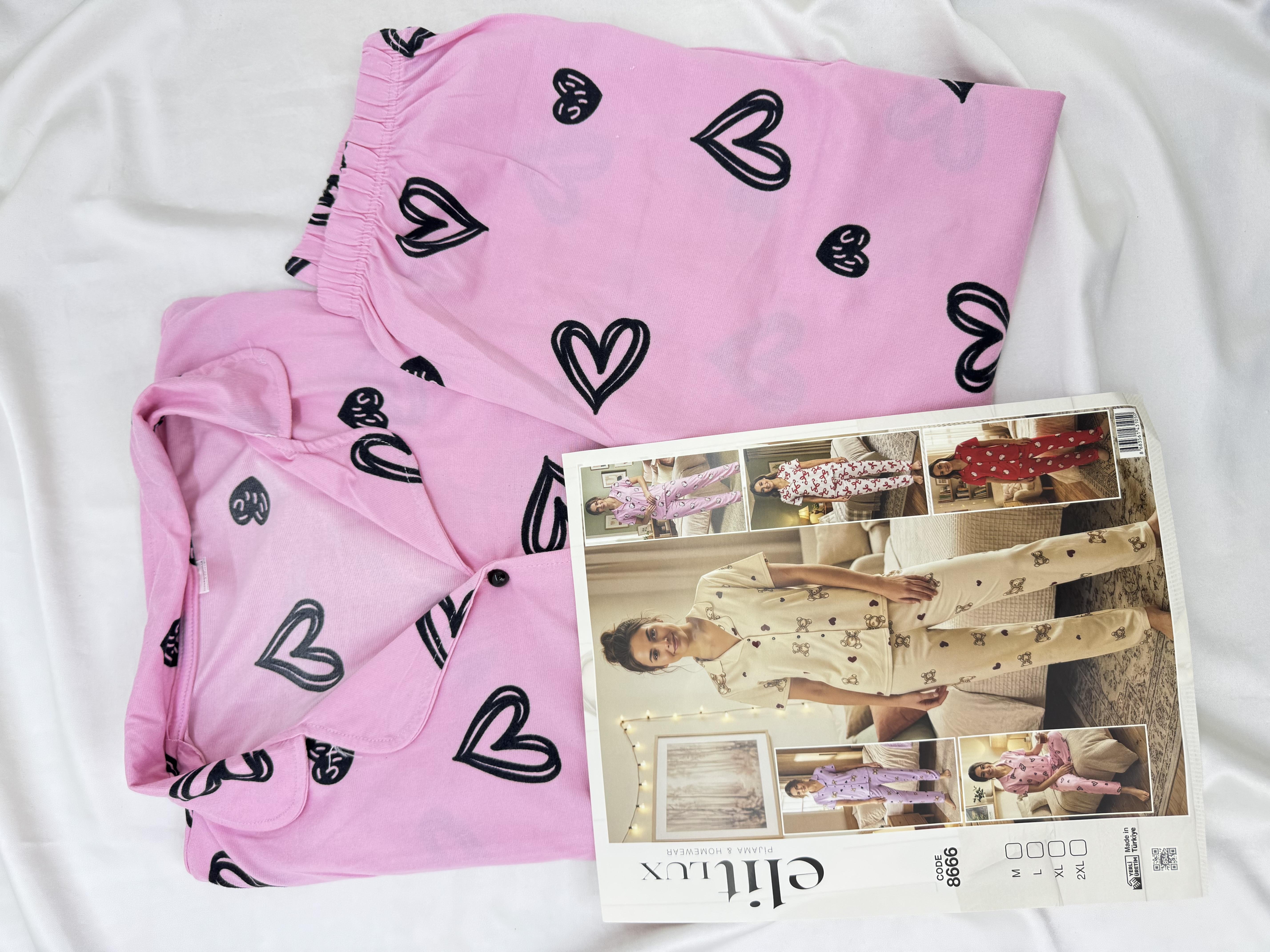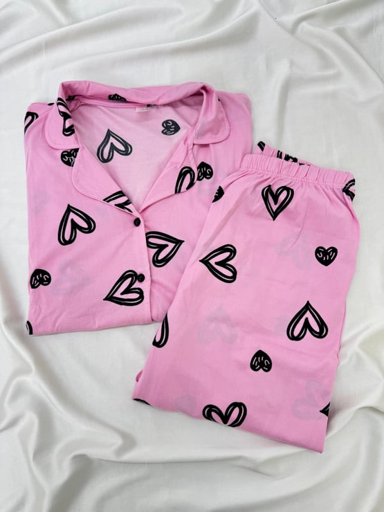 ç8666-milan kumaş gömlek yaka kalpli pıjama takımı-pudra (ç8666)